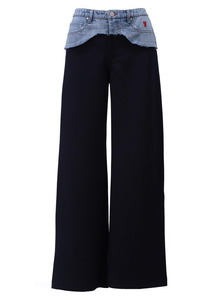 Stijlvol en uniek, deze broek combineert comfort met verfijning. Het opvallende jeans detail aan de bovenkant voegt een trendy twist toe waardoor het lijkt alsof je twee lagen draagt. De broek heeft een wijde pijp wat zorgt voor een flatterende en moderne look die elk figuur complimenteert.